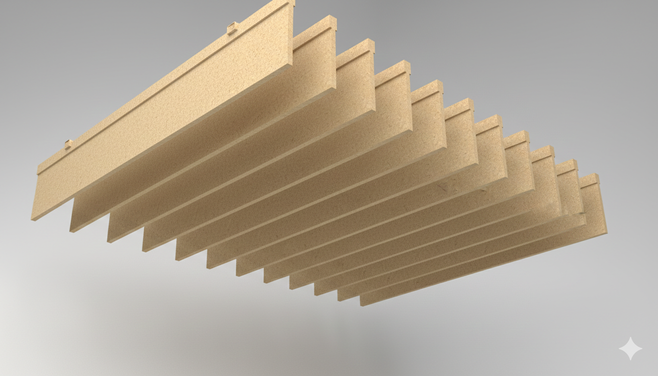 A series of warm, sand-toned PET felt baffles are suspended in a clean, linear formation, creating a refined floating canopy that enhances both acoustics and visual comfort. The evenly spaced vertical fins absorb and diffuse sound while introducing soft architectural depth overhead. Made from sustainable PET felt, this ceiling system offers a calm, contemporary solution for open offices, lobbies, and collaborative spaces seeking improved sound quality with elegant design.